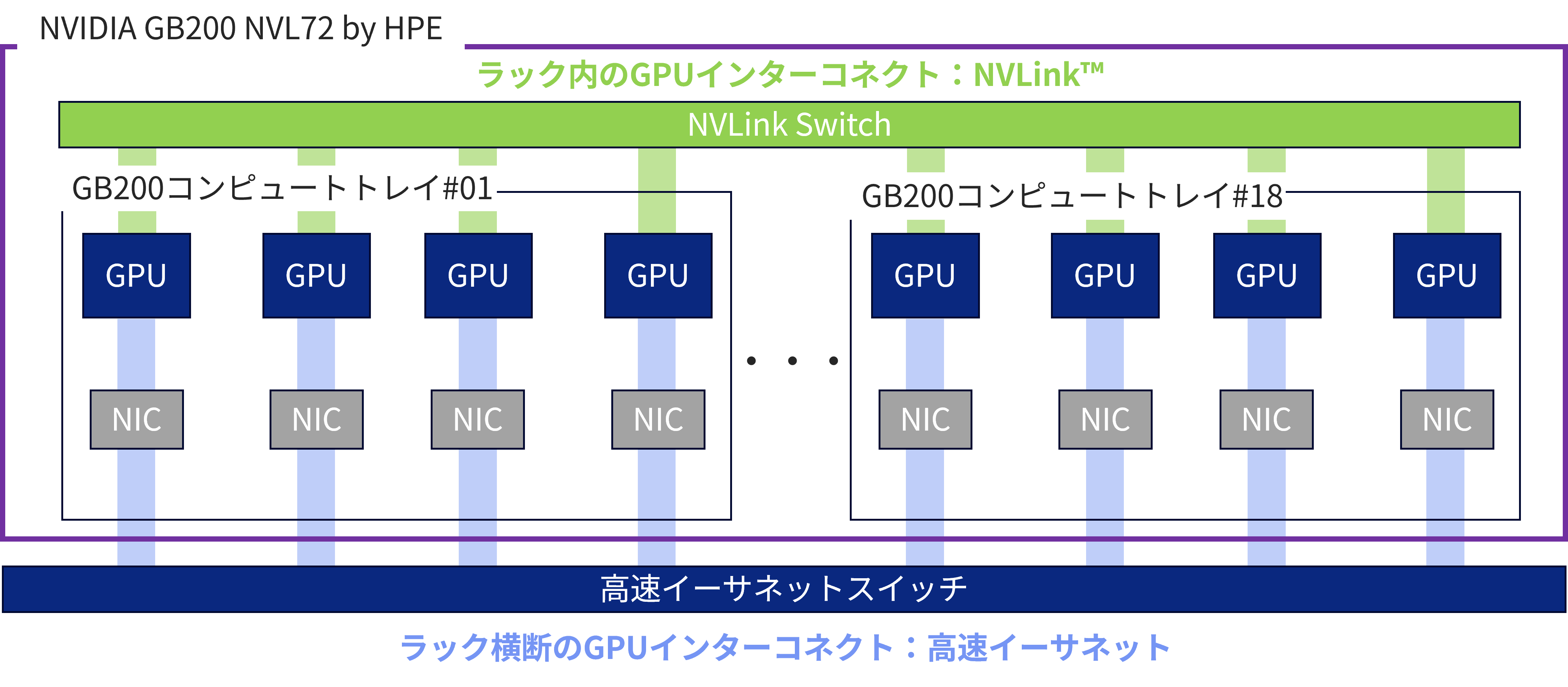 - NVIDIA GB200 NVL72 by HPEのラック内全てのGPUはNVLinkで接続されます。