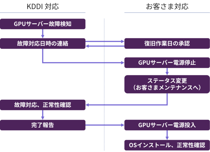 - 復旧作業の日程が確定いたしましたら、お客さまにてGPUサーバーの電源を落としていただく必要があります。(電源を落としていただいていない場合、復旧作業を中断させていただくかKDDIにて強制的に電源を落とさせていただく可能性がございます)