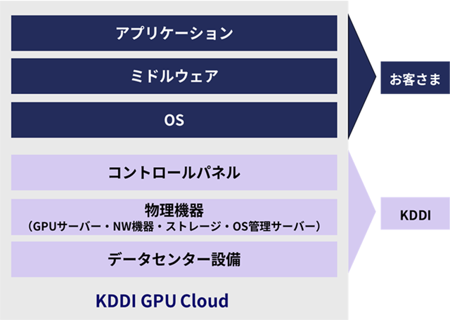 KDDIはデータセンター設備、物理機器、コントロールパネルのソフトウェア部分に対して責任を負います。OS、その上で動作するソフトウェアやコントロールパネルの設定内容および操作はお客さまの責任範囲となり、弊社サポートの対象外となります。